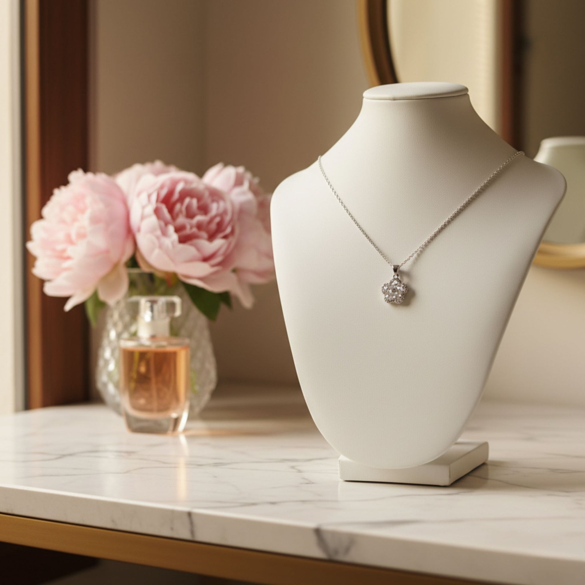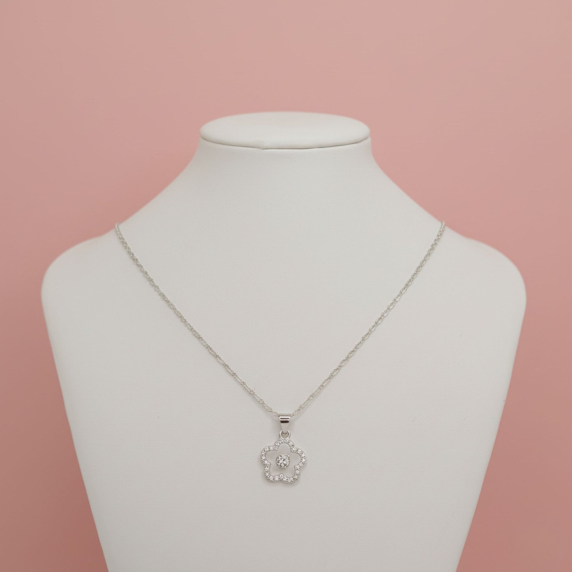 Collar elegante con dije de flor de cinco pétalos adornada con circonitas brillantes. Diseño floral delicado en plata de alta calidad, perfecto para uso diario o especial. Hipoalergénico, cadena ajustable incluida. Símbolo de belleza, crecimiento y renovación que combina con todo. Ideal para regalo o autoregalo.