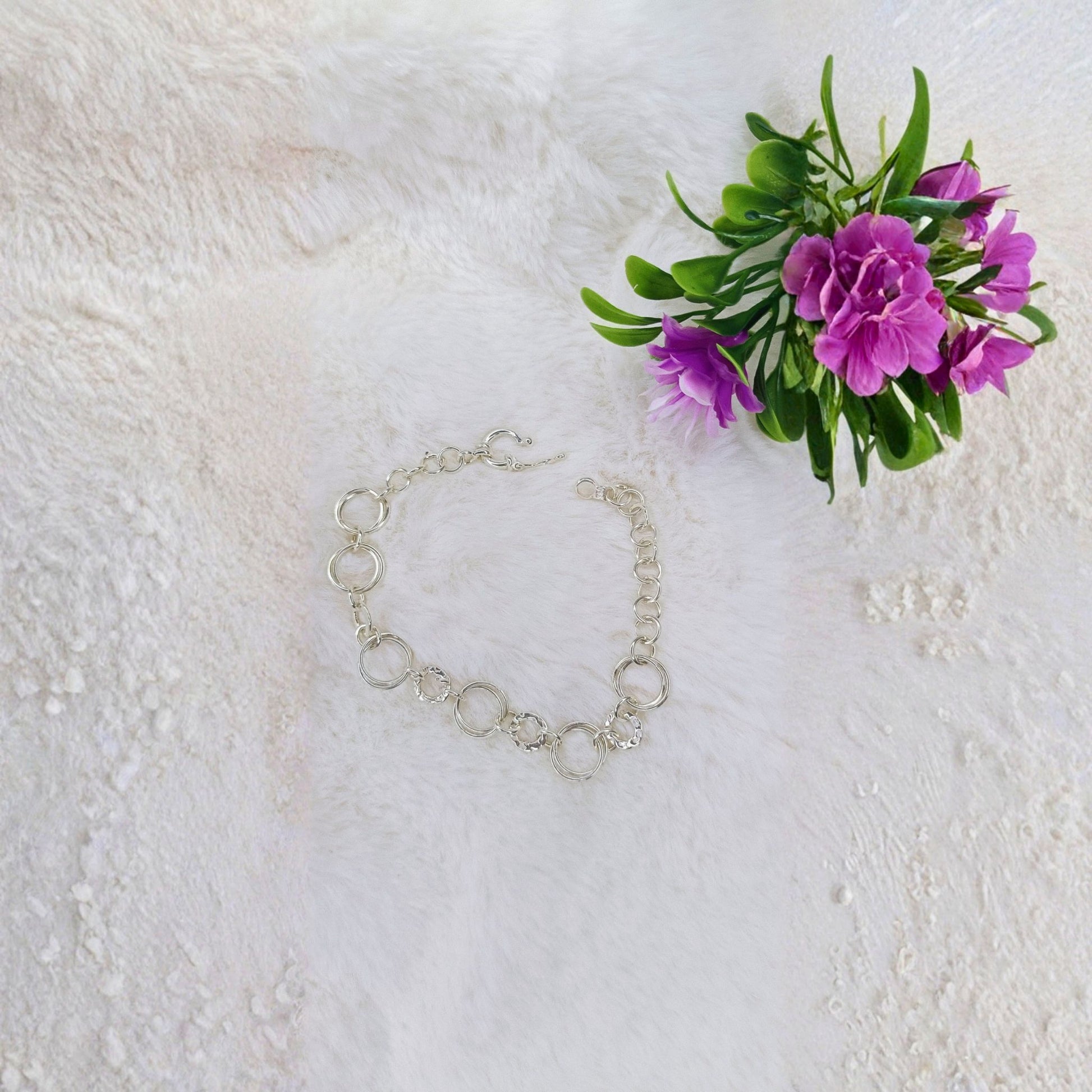 Conexiones que importan. Esta pulsera con círculos entrelazados simboliza los vínculos que nos unen: cada aro representa una relación, un momento, una conexión especial. Los diferentes tamaños y texturas reflejan la diversidad y riqueza de nuestras experiencias. Hipoalergénica, cierre ajustable tipo toggle. Diseño contemporáneo con profundo significado. Para quienes valoran las conexiones auténticas y el estilo moderno.